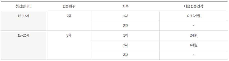 첫 접종 나이 및 접종 내역에 따라 접종 횟수 상이