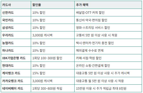 A3. 일부 카드사는 배달앱, 커피, OTT, 편의점 등 추가 할인 혜택을 제공합니다.
