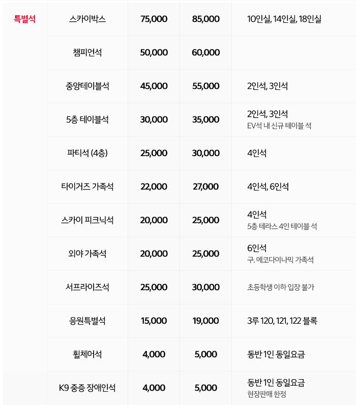 | K5 | 12,000원 | 16,000원 | 1루: 101~106B / 3루: 124~127B |